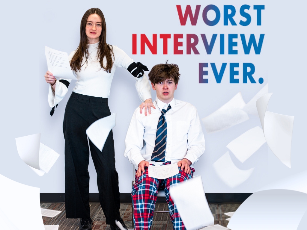 The plot begins as the Interviewee arrives late to the interview. He bursts into the scene with dishevelled hair, a wrinkled blazer, an uneven tie and blue slacks. The tension is immediate as the characters’ personalities clash, the Interviewer’s icy demeanor combats the Interviewee’s optimistic nature. Current University of Calgary’s drama students, Gabrielle Dos de Wael played the Interviewer, while Ian Riep portrayed the Interviewee.