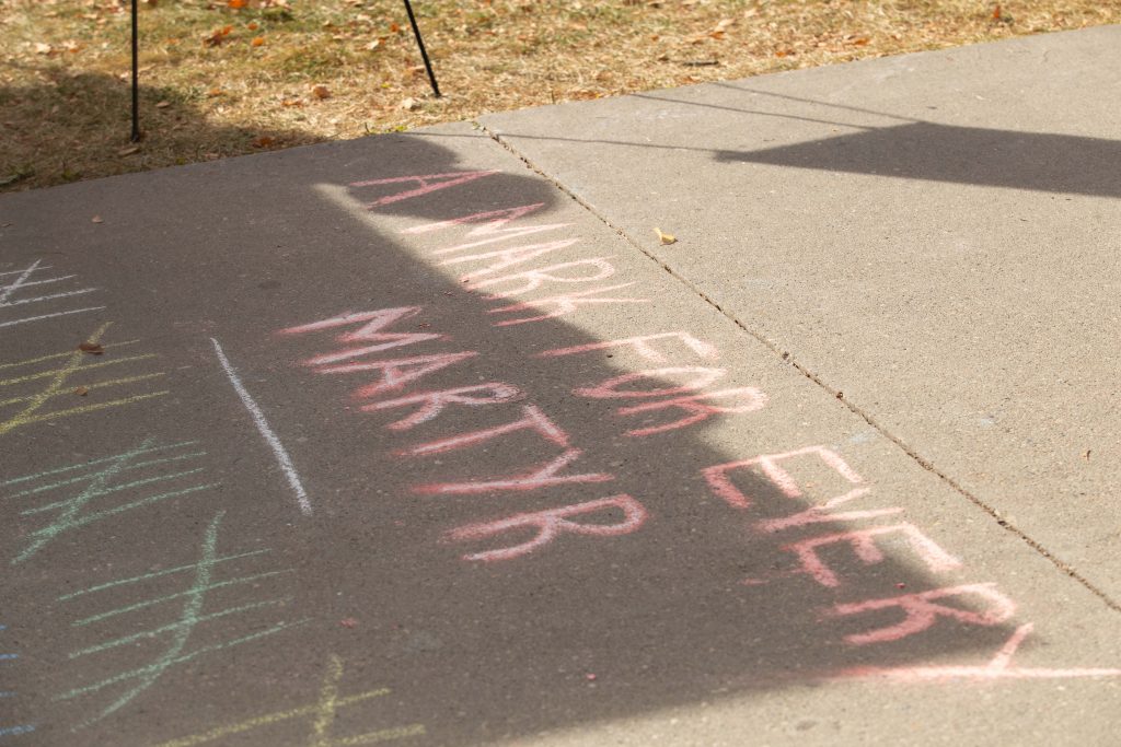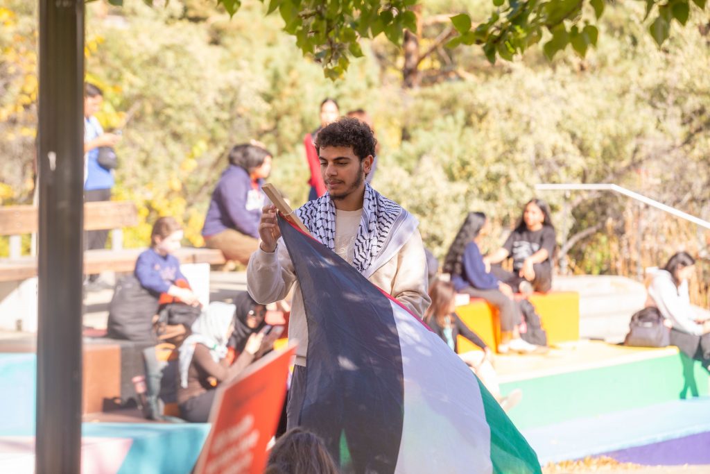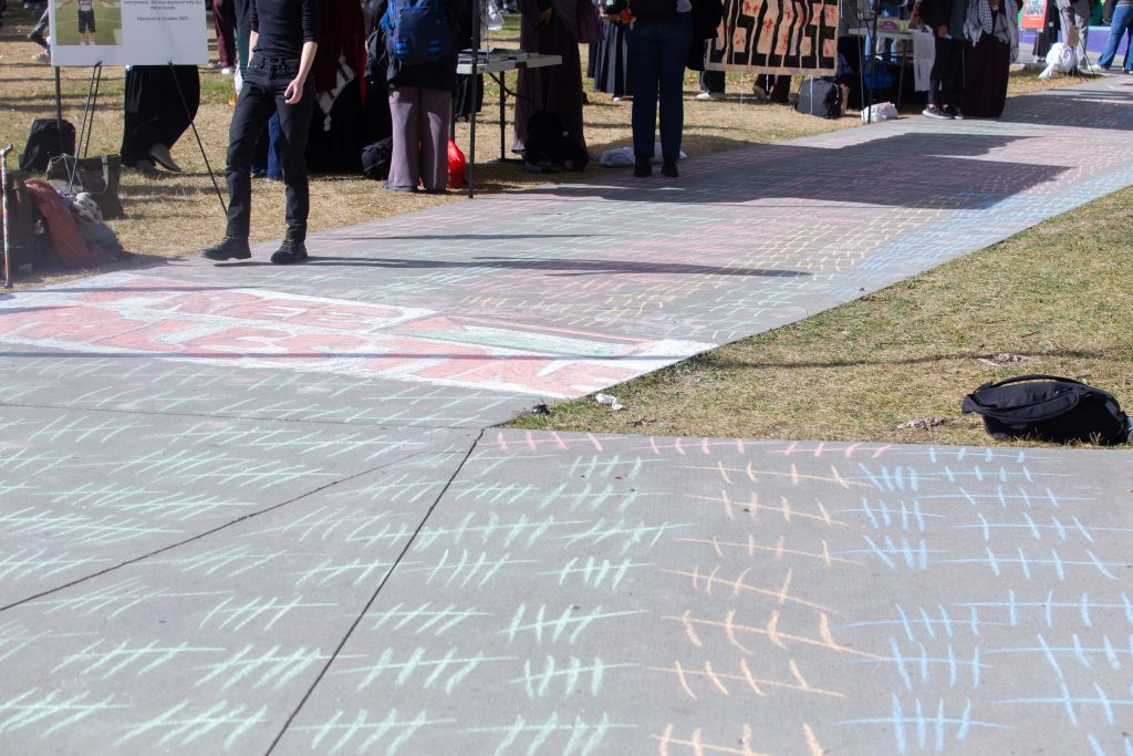 On October 7, at 1:00 p.m., the Palestine Advocacy Club organized a walkout to recognize the two-years that have passed since the Israeli invasion of the Gaza Strip on October 7, 2023. The students first gathered in the Taylor Family Digital Library (TFDL) Quad, setting up signs, tents and writing with chalk. After a series of speeches, the students transitioned to marching around campus.