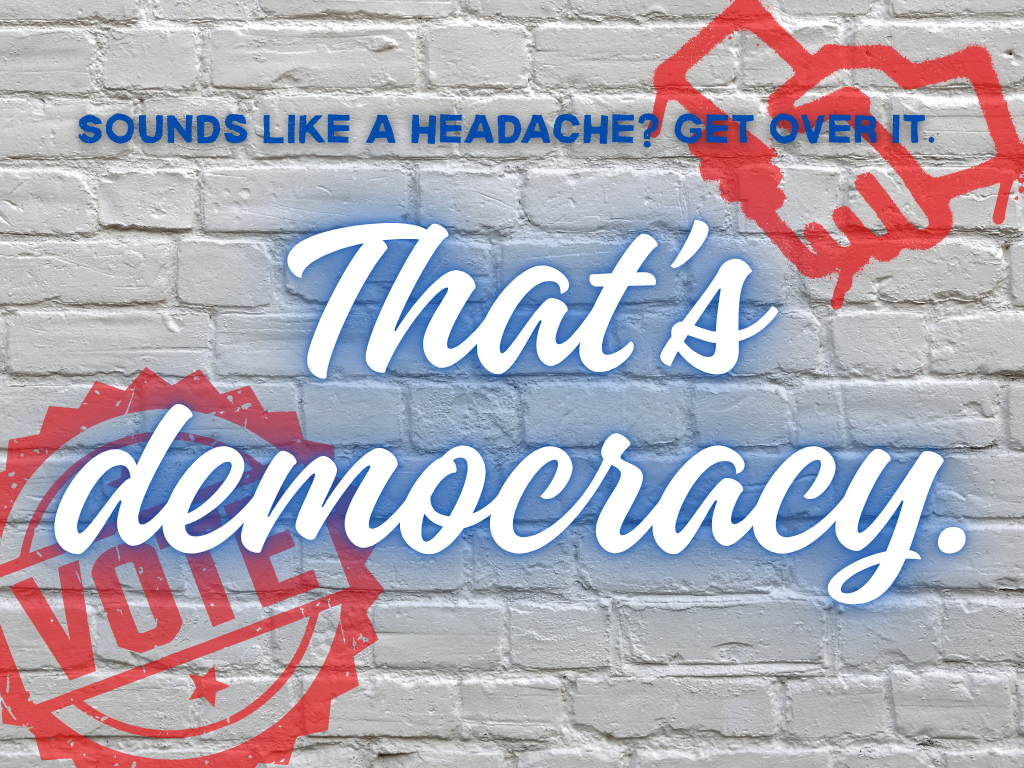If that sounds like a headache, then get over it. That’s democracy.