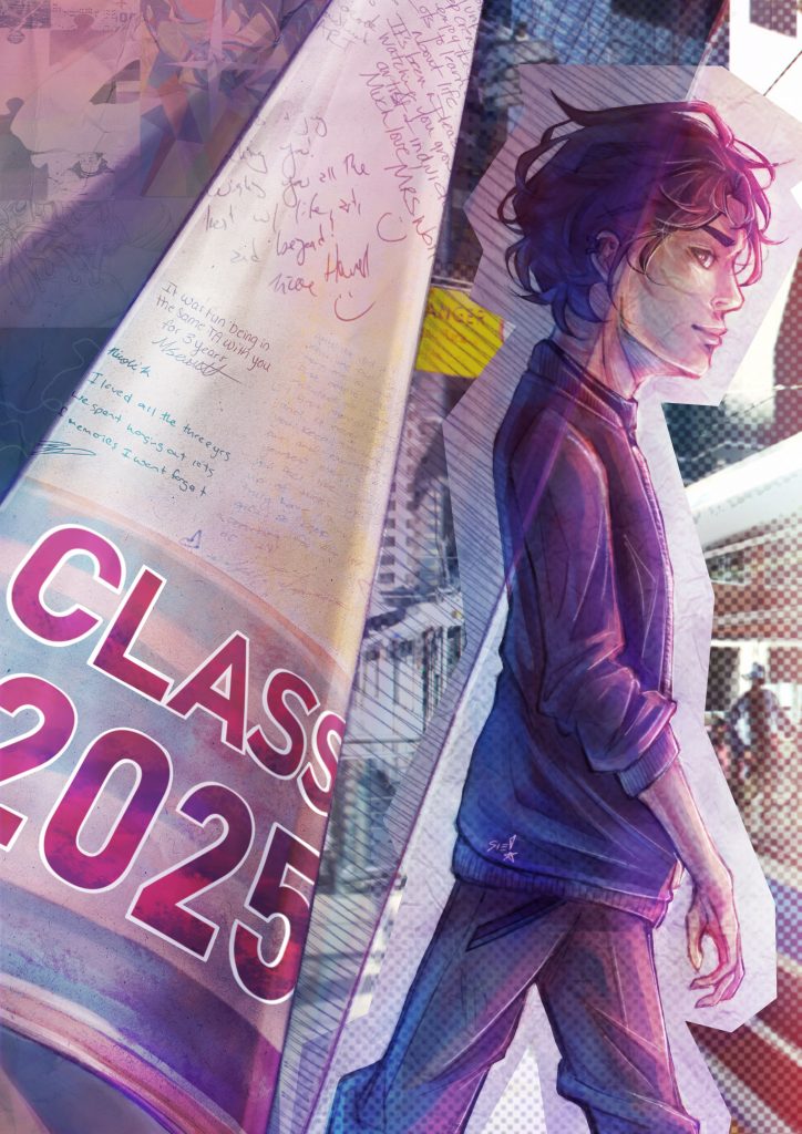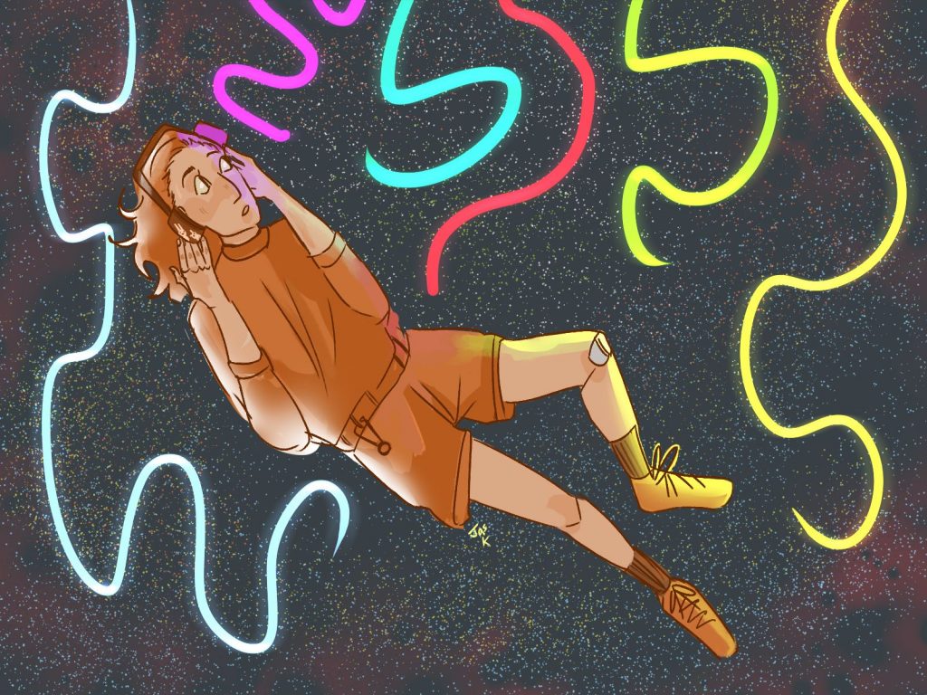 My drawing reflects the theme of a fresh start in university, with the different coloured lines symbolizing the many possible futures and paths a student may choose for themselves. The student is shown floating in space, surrounded by uncertainty, to capture the feeling of navigating the unknown at the beginning of this journey.