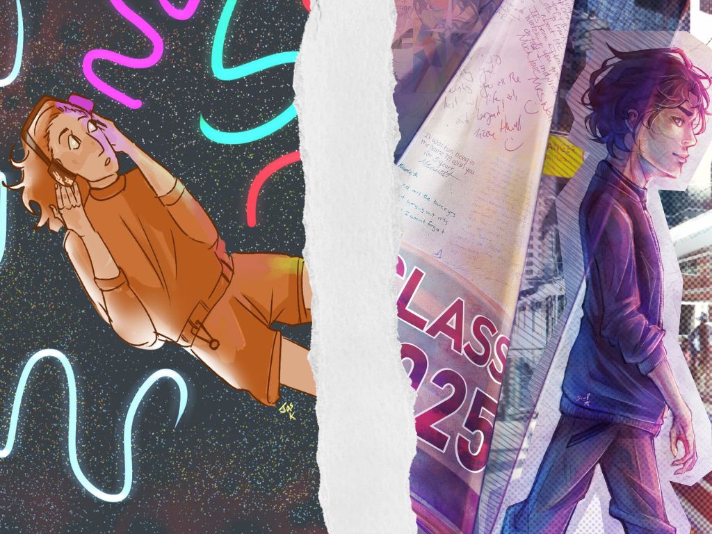 My drawing reflects the theme of a fresh start in university, with the different coloured lines symbolizing the many possible futures and paths a student may choose for themselves. The student is shown floating in space, surrounded by uncertainty, to capture the feeling of navigating the unknown at the beginning of this journey.