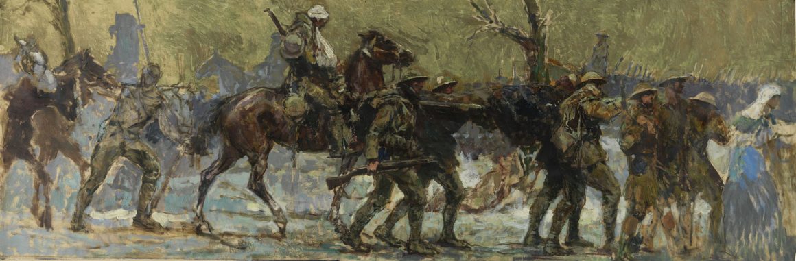 Munnings in his second attempt at enlistment saw him tending for horses in England that would eventually end up on the front lines. Later he was assigned to the Canadian Cavalry Brigade and later the Canadian forestry corp, heading to France, to paint Canadian War Records.