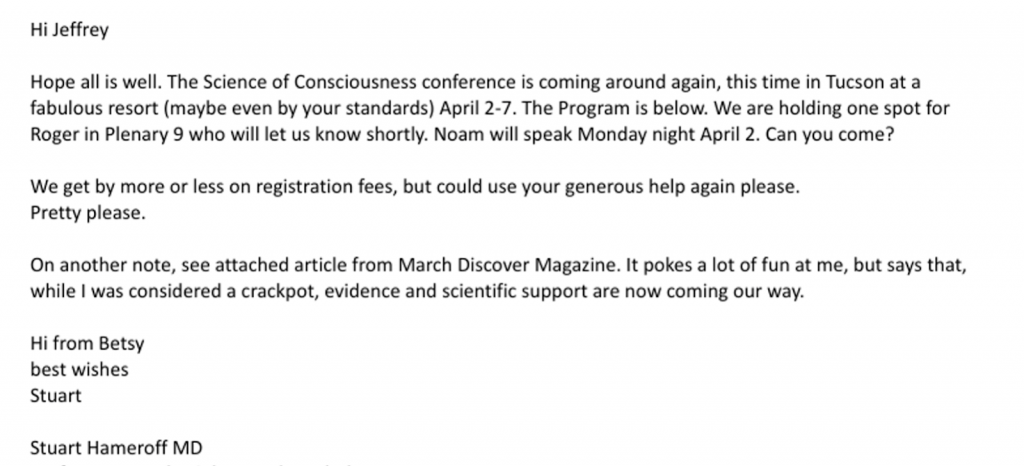 Another is an invite in 2018 to the Science of Consciousness Conference held by Stuart Hameroff, a former anesthesiologist and professor at the University of Arizona.